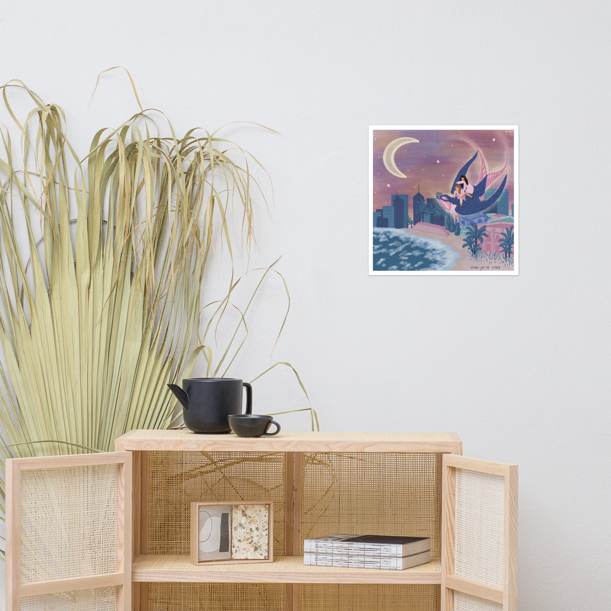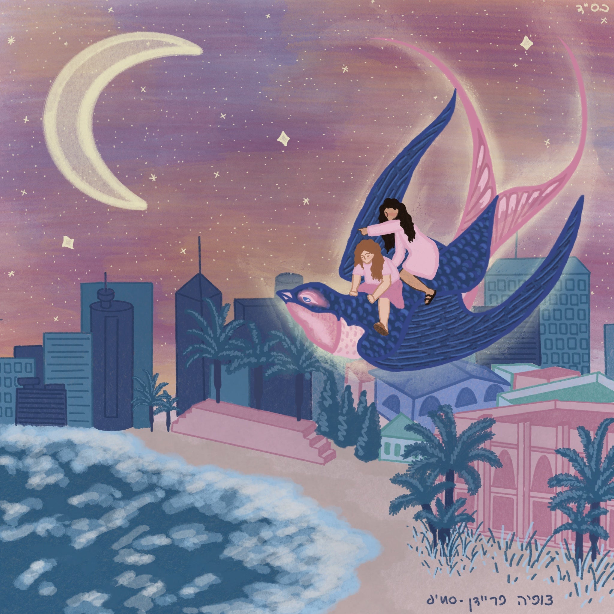 Digital Illustration of two female hostages taken by Hamas on October 7th, Naama Levy and Liri Albag, soaring over the Tel Aviv skyline on the wings of a dove. Inspired heavily by the concept in Torah that we will be flown to redemption "on the wings of eagles", and by the bracha "Blessed are you, Hashem our Lord, who frees the hostage."