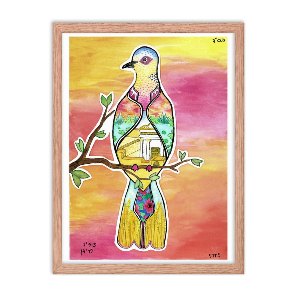 Illustration of a Turtle Dove, the korban that is brought to the Beis Hamikdash when someone undergoes Giyur, due to the fact that the entire korban must be given up to HaShem. Within the illustration, there is wheat, associated with the story of Ruth, and a pond, which is representative of the mikveh and restoration.