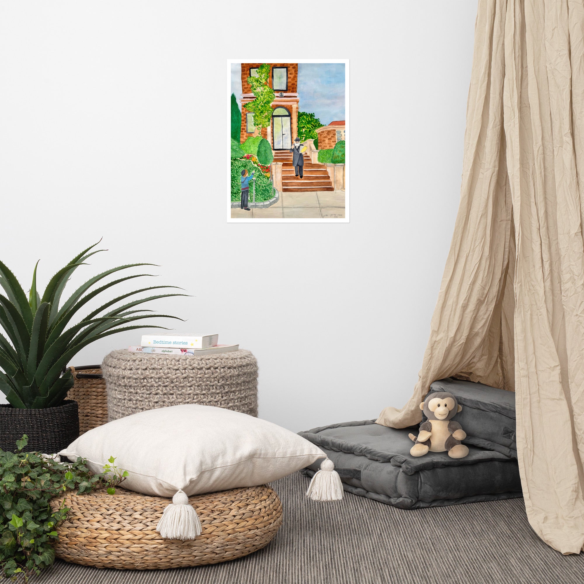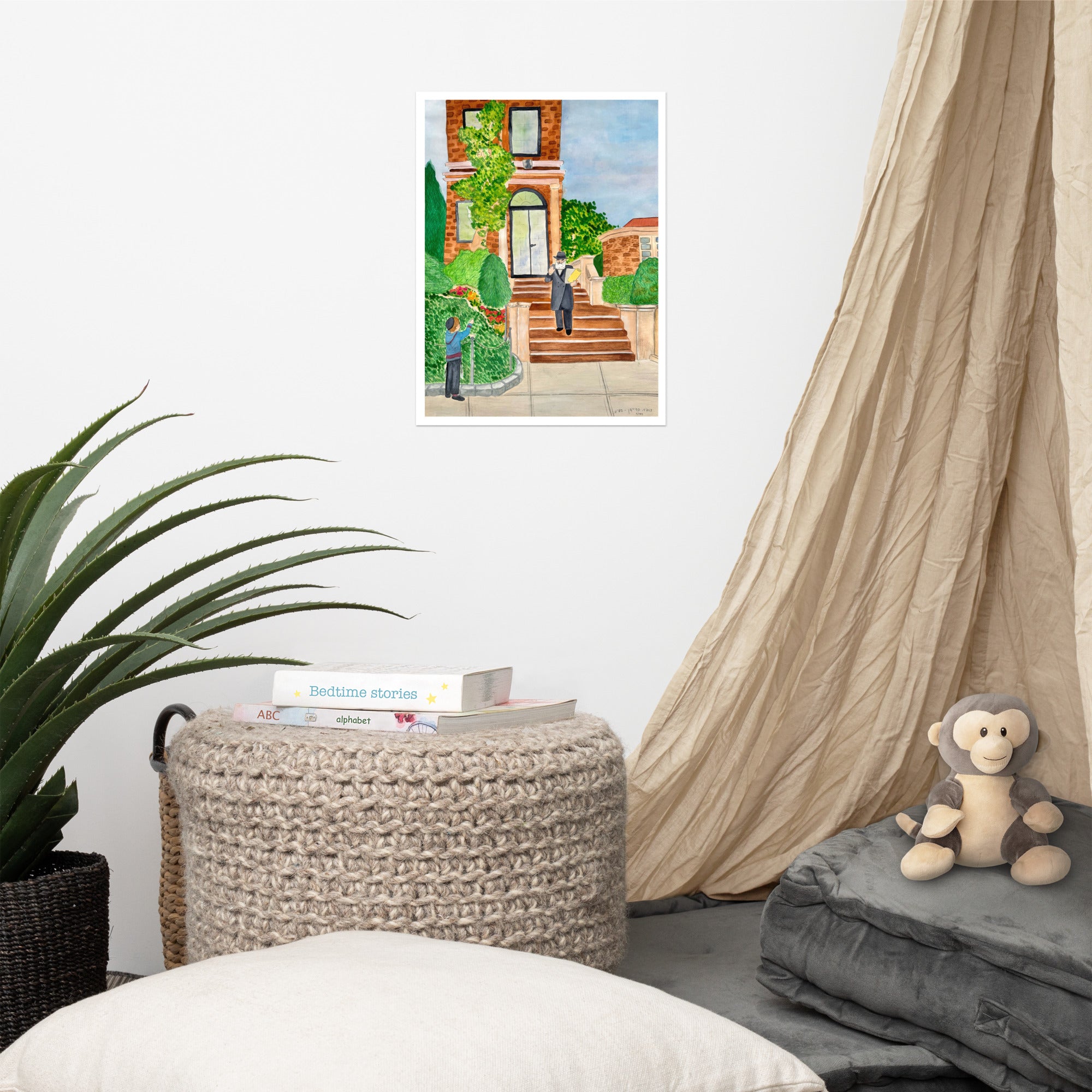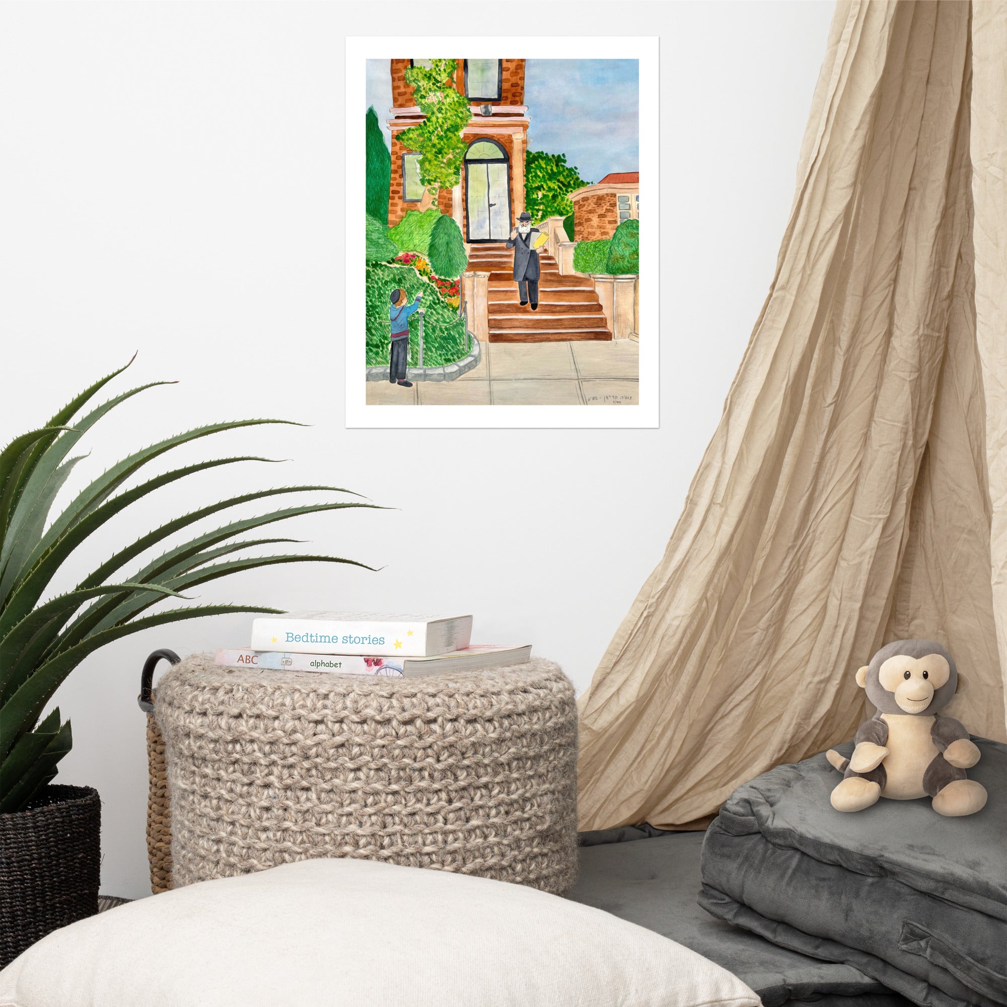 Mixed media illustration of the Rebbe leaving his house on President Street and greeting a small child. The original image has been framed on my wall for years, and I enjoy specifically images where you see the Rebbe smile. This image has brought joy to me for a long time and I hope that this piece will bring joy to your home as well.